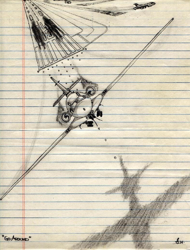 I think drawn during a class? This is a later version of this "departure" style (titled "Go-Around) and proof that I would basically draw on whatever was available at the time!? - In this case a piece of standard wide ruled looseleaf paper. (also notice the 2 yr difference between the two versions)