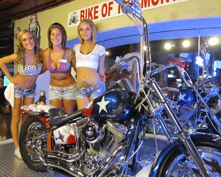 Rachel, Holly and Stephanie show me the Bike of the Month - Know what the awesomest thing about this picture is?... Yup, the bomber on the bike's side fairing! - Awwww-some!...