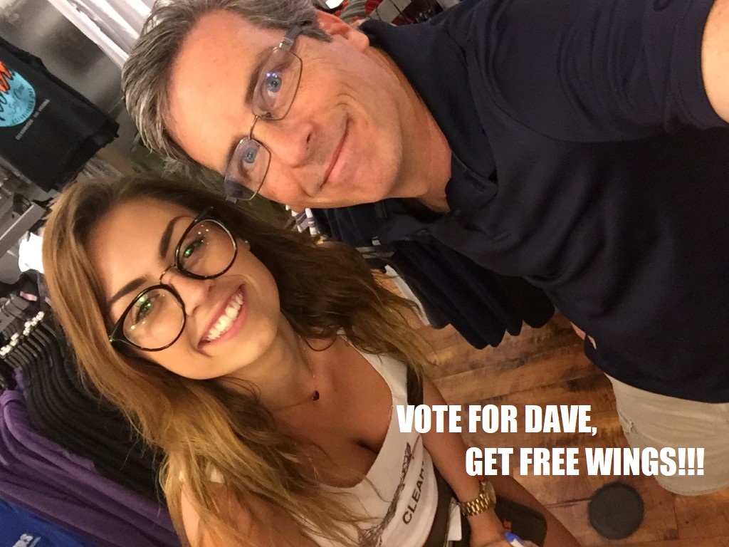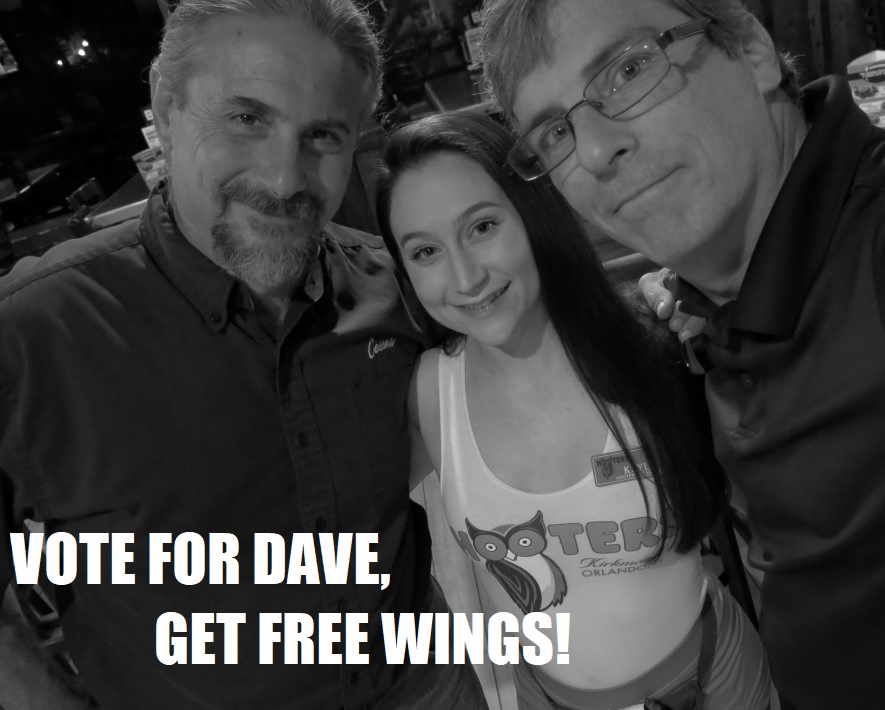 FREE WINGS!” and “VOTE FOR DAVE, GET FREE COMICS!”
